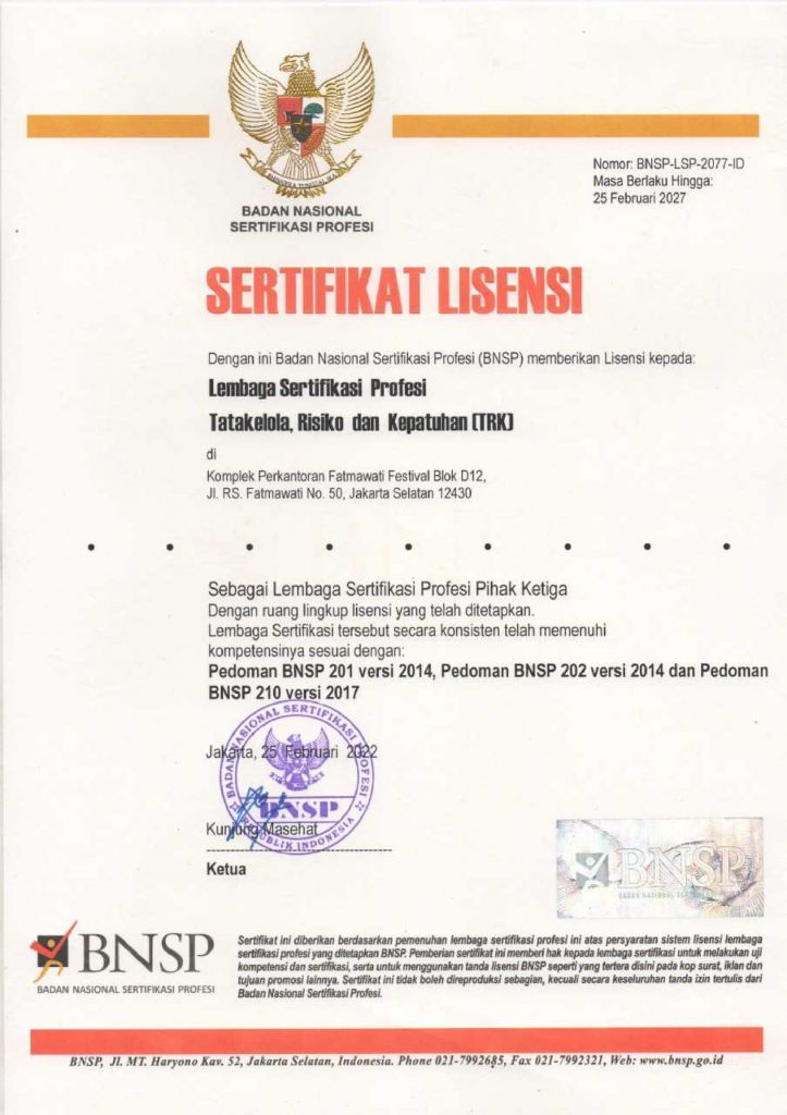 Lembaga Sertifikasi Profesi. Tatakelola, Risiko, dan Kepatuhan (LSP-TRK) dibentuk sebagai wujud nyata komitmen para profesional di Indonesia dalam rangka mendukung penerapan dan pengembangan Tatakelola, Risiko, dan Kepatuhan (Governance, Risk, and Compliance) di berbagai organisasi, LSP-TRK telah memperoleh lisensi dari Badan Nasional Sertifikasi Profesi (BNSP) sebagai lembaga sertifikasi Profesi Pihak Ketiga (BNSP-LSP-2077-ID).